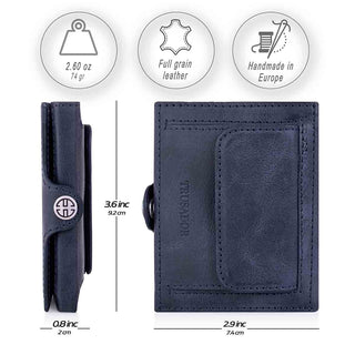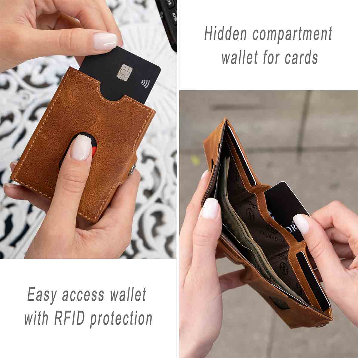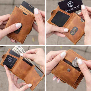 • Zarif ve Kompakt Ön Cep Deri Cüzdan - Bu deri üçlü katlanabilir cüzdanın zarif tasarımı, günlük kullanımlarında minimalist bir yaklaşım tercih edenler için mükemmeldir ve depolama konusunda taviz vermeden uygun boyutlardadır. Bu cüzdanın kompakt boyutu, geleneksel cüzdanların verebileceği hacimli hissi ortadan kaldırarak ön cebinize mükemmel uyum sağlar. İnce tasarımı, cebinizde veya çantanızda taşımayı da kolaylaştırırken gereksiz hacim veya ağırlık eklemiyor.